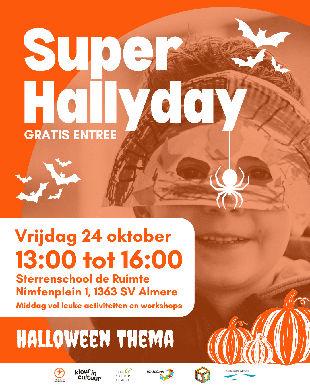 Op vrijdag 24 oktober verandert Sterrenschool De Ruimte in Almere-Poort in een bruisende plek vol sport, spel en Halloween plezier tijdens het evenement Super Hallyday! Een middag vol activiteiten voor kinderen en jongeren, waar je je kunt uitleven tijdens sportieve workshops zoals zaalvoetbal, kickboksen en spelactiviteiten, of juist je creativiteit kunt laten spreken in allerlei kunstworkshops.
